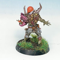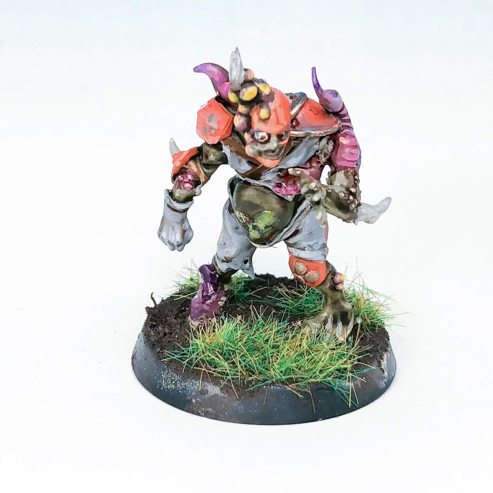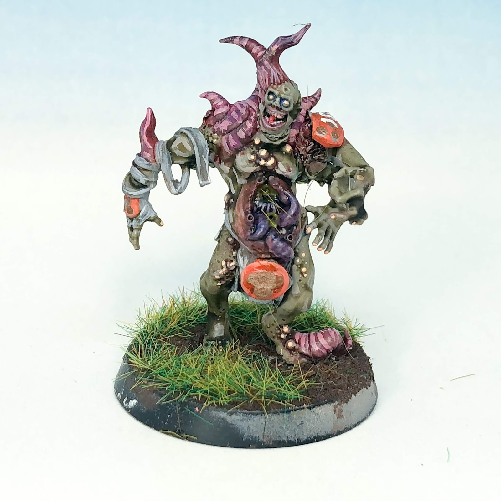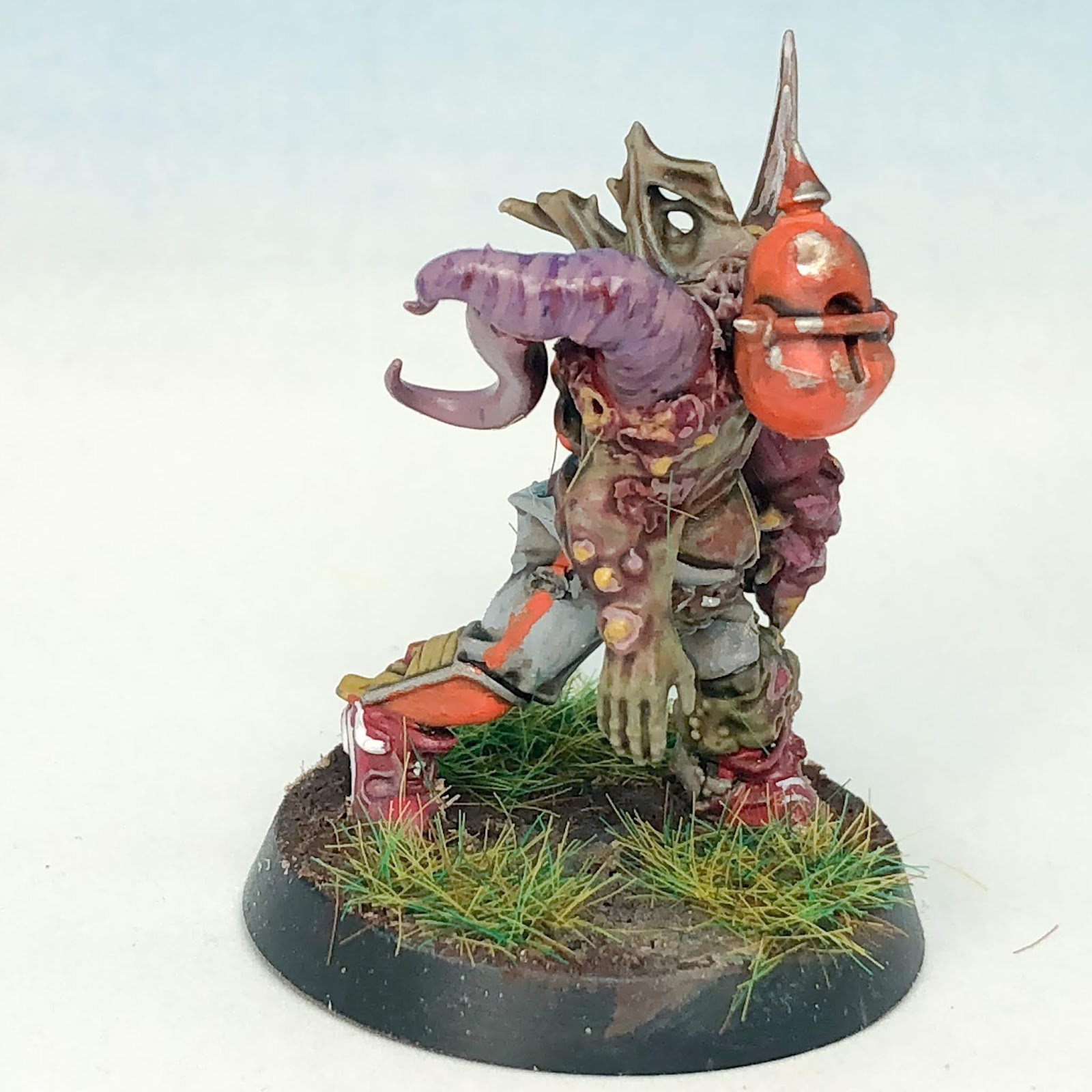 For the conversion of the pieces, I used various sprues from other kits, particularly from the Nurgle range of Age of Sigmar. In some cases, I used AoS miniatures to create completely new pieces. For the team’s color scheme, I opted for orange for the armor and gray for the fabric, with appropriate color variations based on the nature of the pieces themselves (dirt, pus, vomit, etc.).